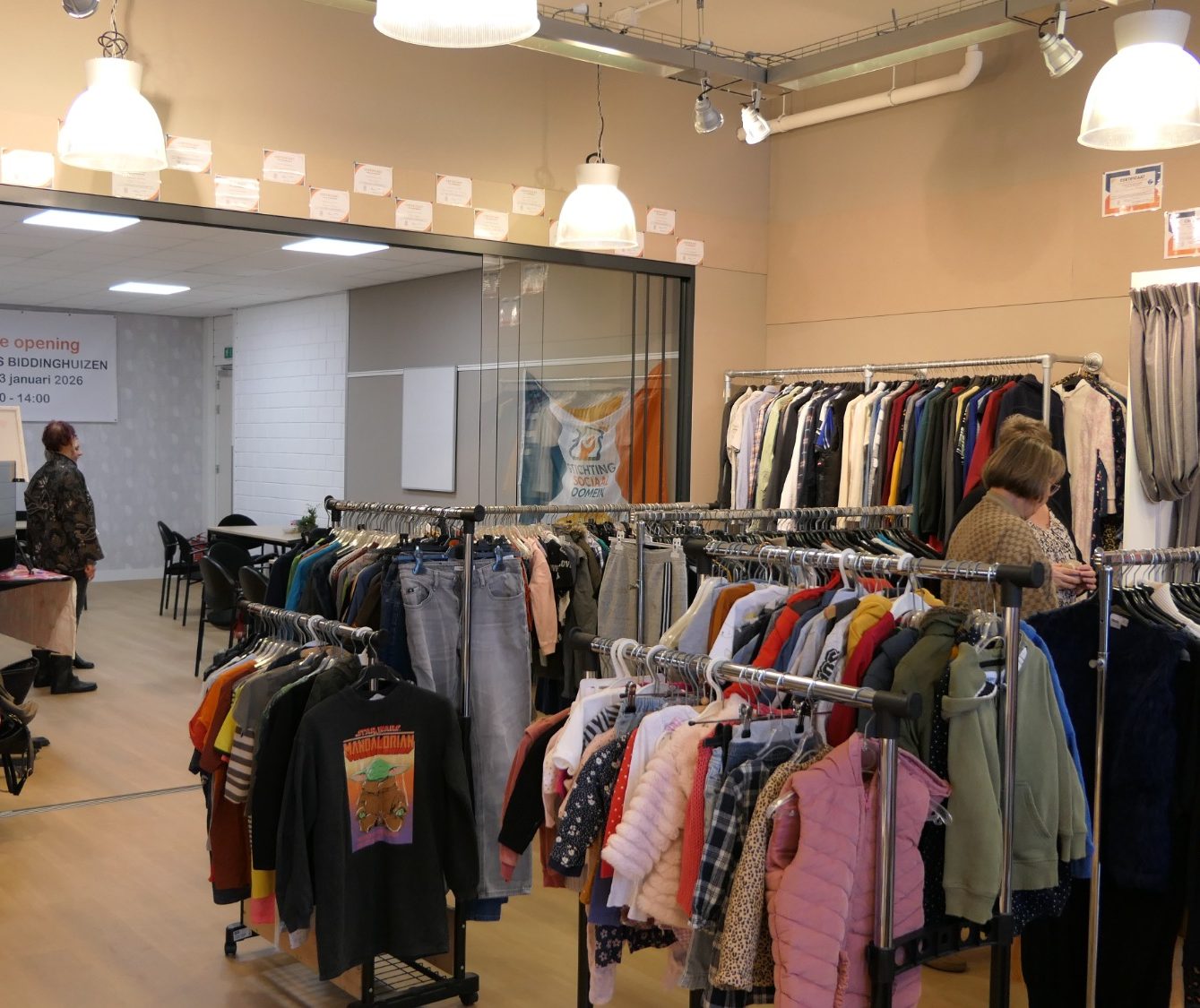Met betaalbare prijzen zorgen we ervoor dat iedereen toegang heeft tot mooie, kwalitatieve kleding – ongeacht budget. Wat je bespaart, kun je besteden aan andere belangrijke dingen in het dagelijks leven. Bovendien blijft het geld dat binnenkomt in de lokale economie: we gebruiken onze inkomsten om maatschappelijke initiatieven in Biddinghuizen te ondersteunen.